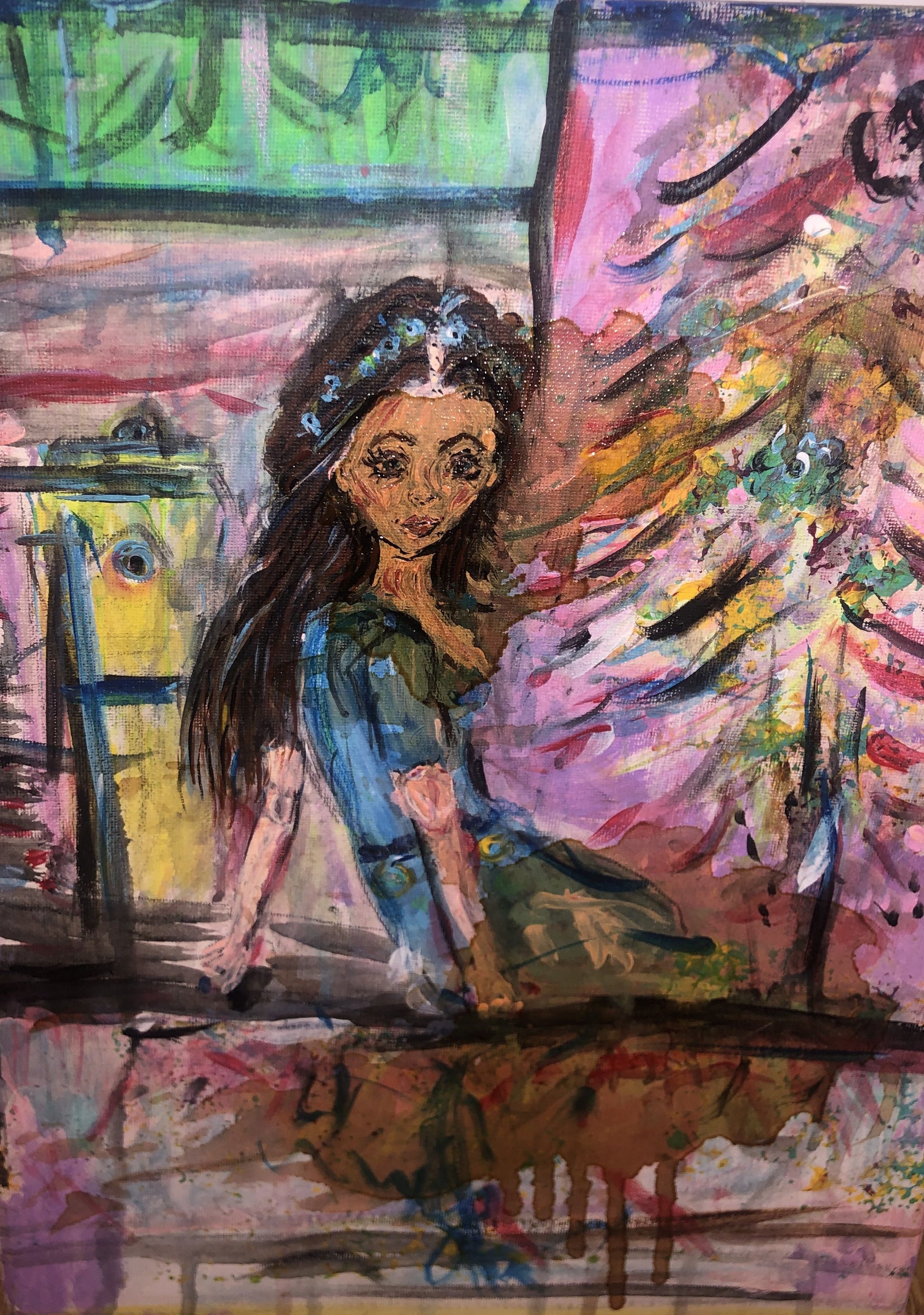Description: Beautiful Angela; a woman of hope, and journey gaze upon the outside world of possibilities.A contemporary painting of channeling possibilities & wonder.