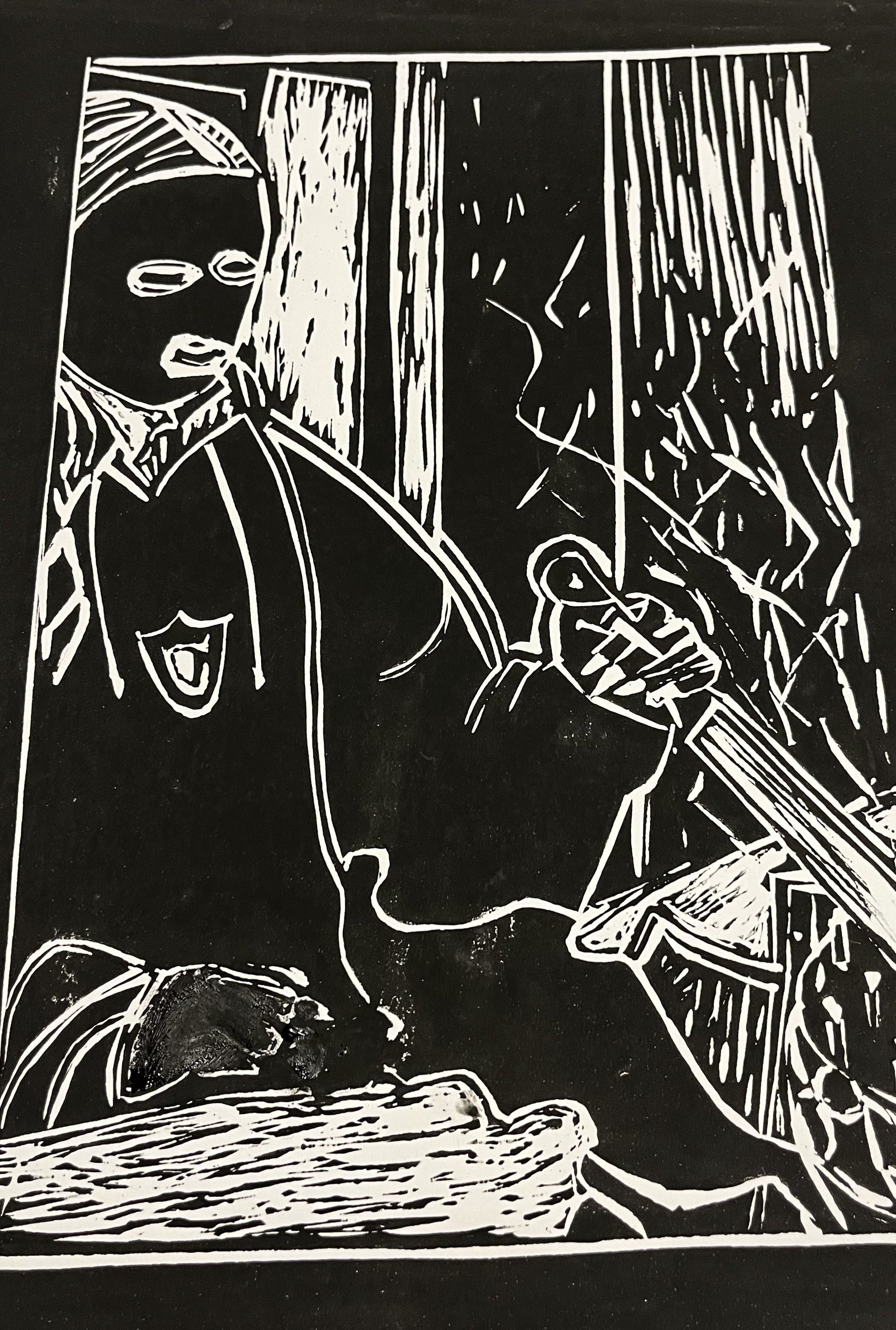 Description: Lino print in black ink on A3 paper. This print is part of a series of prints titled Balaclava - looking at the use of the balaclava and youth culture.