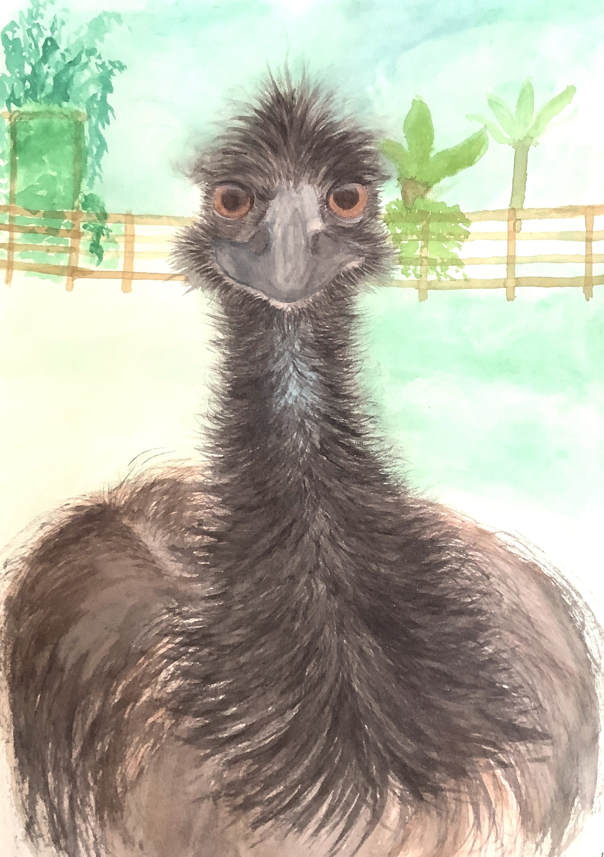 Description: Emmanuel's water colour illustration is based on a real Emu who lives in Florida with his family of friends @knucklebumpfarms. I painted him in watercolour with iridescent medium and sealed him with a semi gloss varnish.